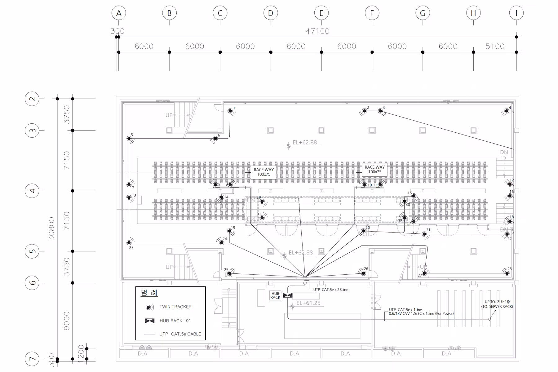 트윈트래커의 설치는 정확한 설계 도면을 기반으로 이루어지며, 실제 현장 사진을 통해 설치 상태를 명확히 확인할 수 있습니다. 이를 바탕으로 한 직관적인 모니터링 화면과 현실감 있는 3D 시각화 환경으로 이어져, 설치에서 운영까지 일관되고 명확한 위치추적 솔루션을 제공합니다.